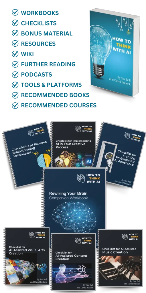 Over 360, 7″x10″pages that dives hard into a new way to think so you can think better with AI.  Downloadable assets are extensive and include a 90-day set of exercises that will rewire your brain so you recognize your biases and other thought-limiting patterns to enable you to allow AI to expand your horizons.